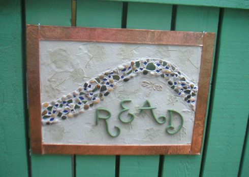 Plaster, clay and mosaic garden art created by the school children for the literacy garden