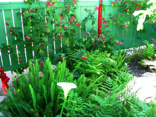 Abutilon in background, ferns and calla lilies