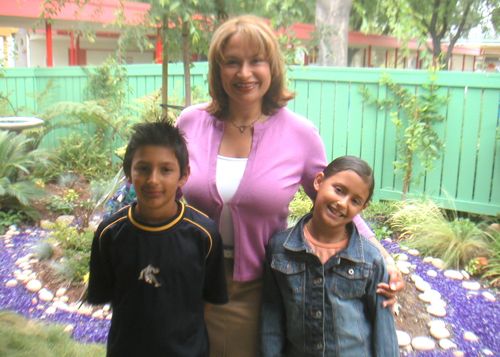 Designer Shirley Bovshow with her children in front of the Literacy Garden in 2004